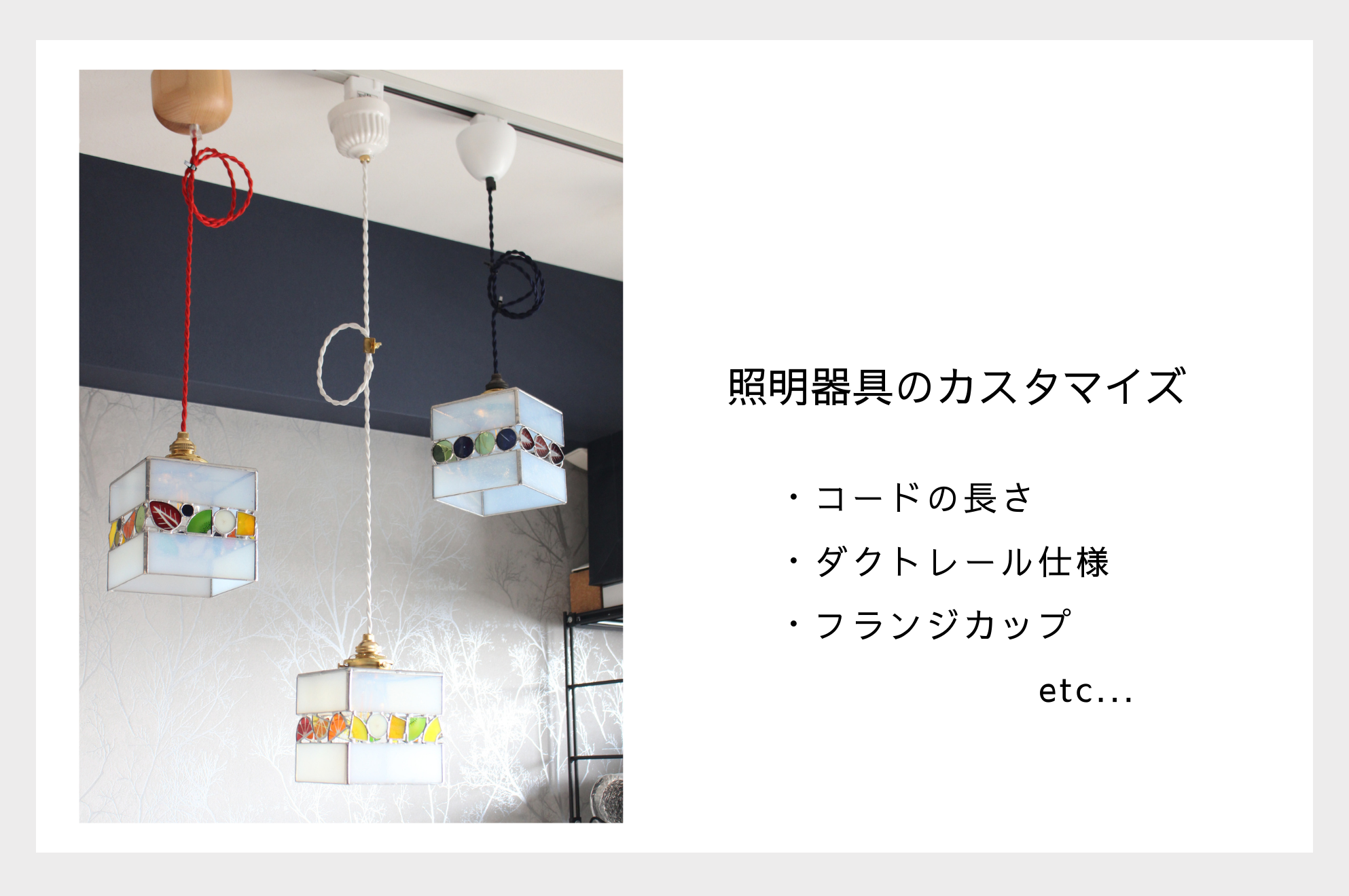 ・照明器具のカスタマイズ品は取り寄せとなりますので、通常納期より+2週間ほどお時間を頂戴することがございます。
